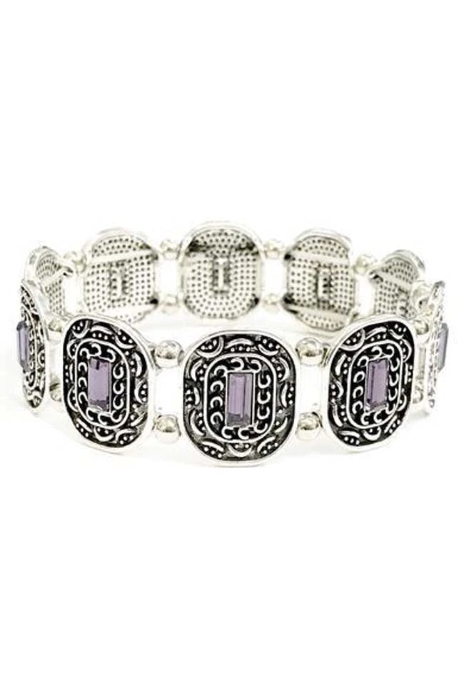 Faceted petite purple gems are pressed into the centers of silver frames. The ornate frames are threaded along elastic stretchy bands, alternating with silver beads and creating a whimsical look around the wrist.